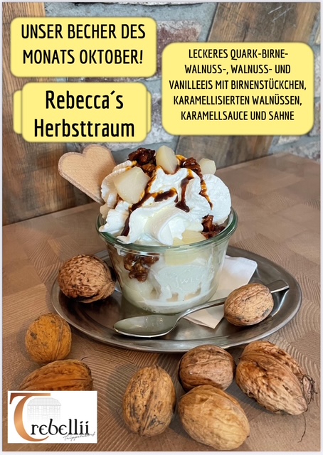 Rebecca’s Herbsttraum verführt Dich mit einer cremigen Kombination aus Quark-Birne-Walnuss-, Walnuss- und Vanilleeis – verfeinert mit saftigen Birnenstückchen, karamellisierten Walnüssen, feiner Karamellsauce und einer Krone aus frischer Sahne.